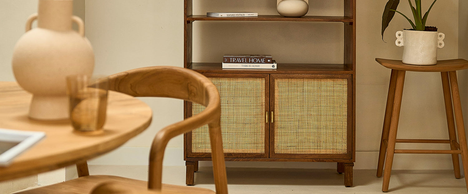 Cada pieza de mobiliario de la colección RAPHAEL, desde el mueble de TV hasta el aparador o el armario, encarna la quintaesencia del encanto atemporal. Explora con nosotros las sutilezas de la colección RAPHAEL, donde la calidez de la madera, la luz del trabajo en caña y la nobleza del acabado nogal se combinan para una experiencia interior excepcional en tu salón .