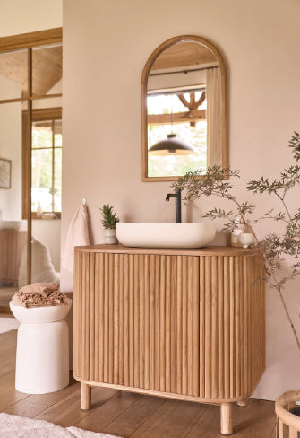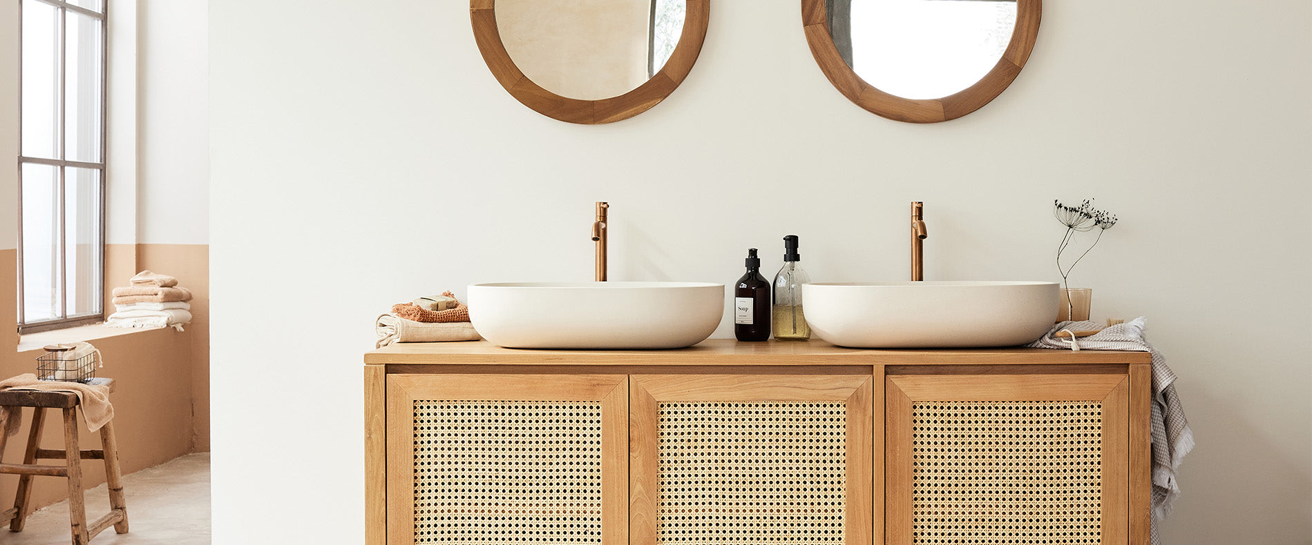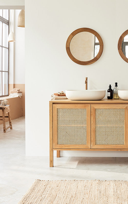 Descubra nuestra selección de muebles de lavabo de madera maciza, columnas de almacenamiento y lavabos para combinar funcionalidad y elegancia. Complete su espacio con nuestros espejos y toalleros, añadiendo un toque natural y contemporáneo a su cuarto de baño.